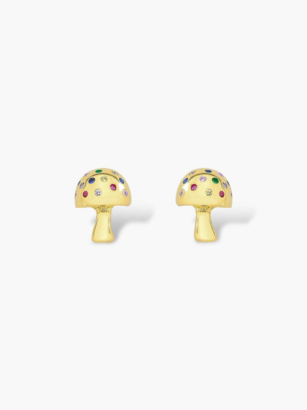 Brinco pequeno com desenho de cogumelo e pedrinhas cravejadas coloridas. Design divertido e interessante para deixar seu mix mais estiloso no dia a dia.